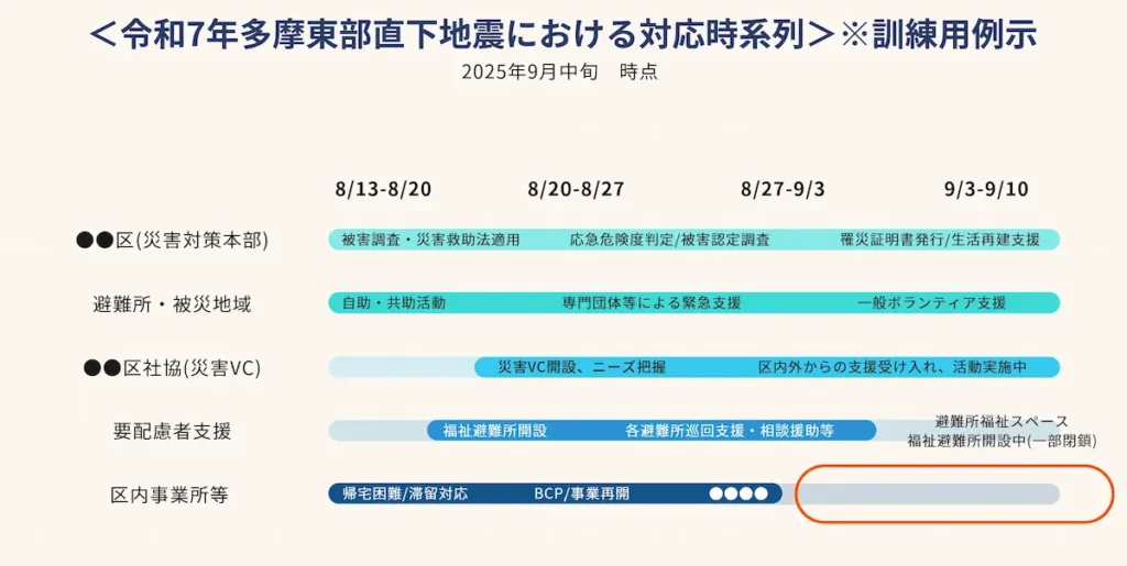そこで該当地域の被害想定やシナリオに加え、下記のような対応時系列を例示しました。