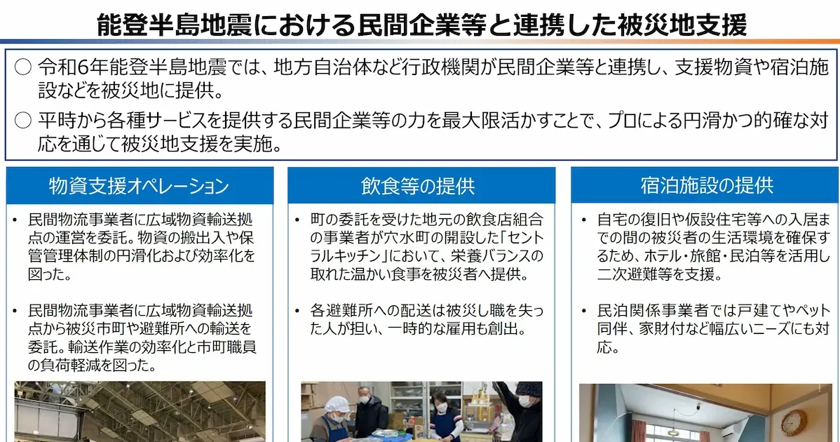 大規模災害時には行政機能による対応は限界があることから、民間団体・NPOや民間企業との連携が欠かせません。具体的な考え方や事例等は 内閣府防災庁設置準備室(令和7年2月17日)資料.pdf でまとめられていますので、こちらをご覧ください。