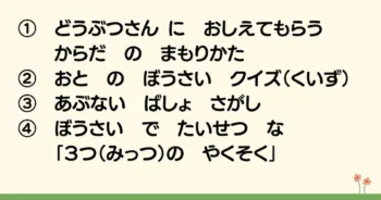 最後のプログラムは、安全行動や音、周囲の状況を確認して身の安全を確保したあとの「暮らし」に関する内容として「3つのやくそく」を伝えました。