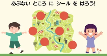 4歳さん、5歳さん、6歳さんの順番で、どちらかのイラストで「ここがあぶないな」と思う場所にシールを貼ってもらいました。イラストは著作権の関係上、本稿ではお示しできませんが、保育士の方及び幼稚園・小学校の教員の方については実施の写真(園ブログで公開されているもの)や、実物の購入方法や貸与などもご案内しますので お問い合わせフォーム からご連絡ください。