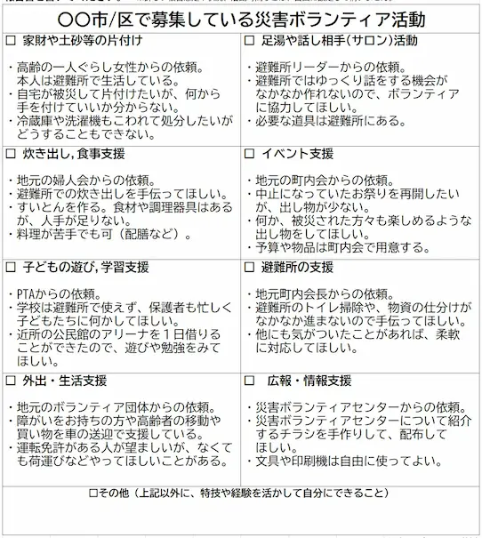 家財や土砂等の片付けなど体力が必要なものだけ、あるいはサロン活動などのコミュニケーションだけ、など幅が狭いと「やっぱり私にはできないかも」と思ってしまうので、できるだけ多様な活動があることを示します。シートに記載しているのはいずれも実際にボランティアが関わった支援活動です。